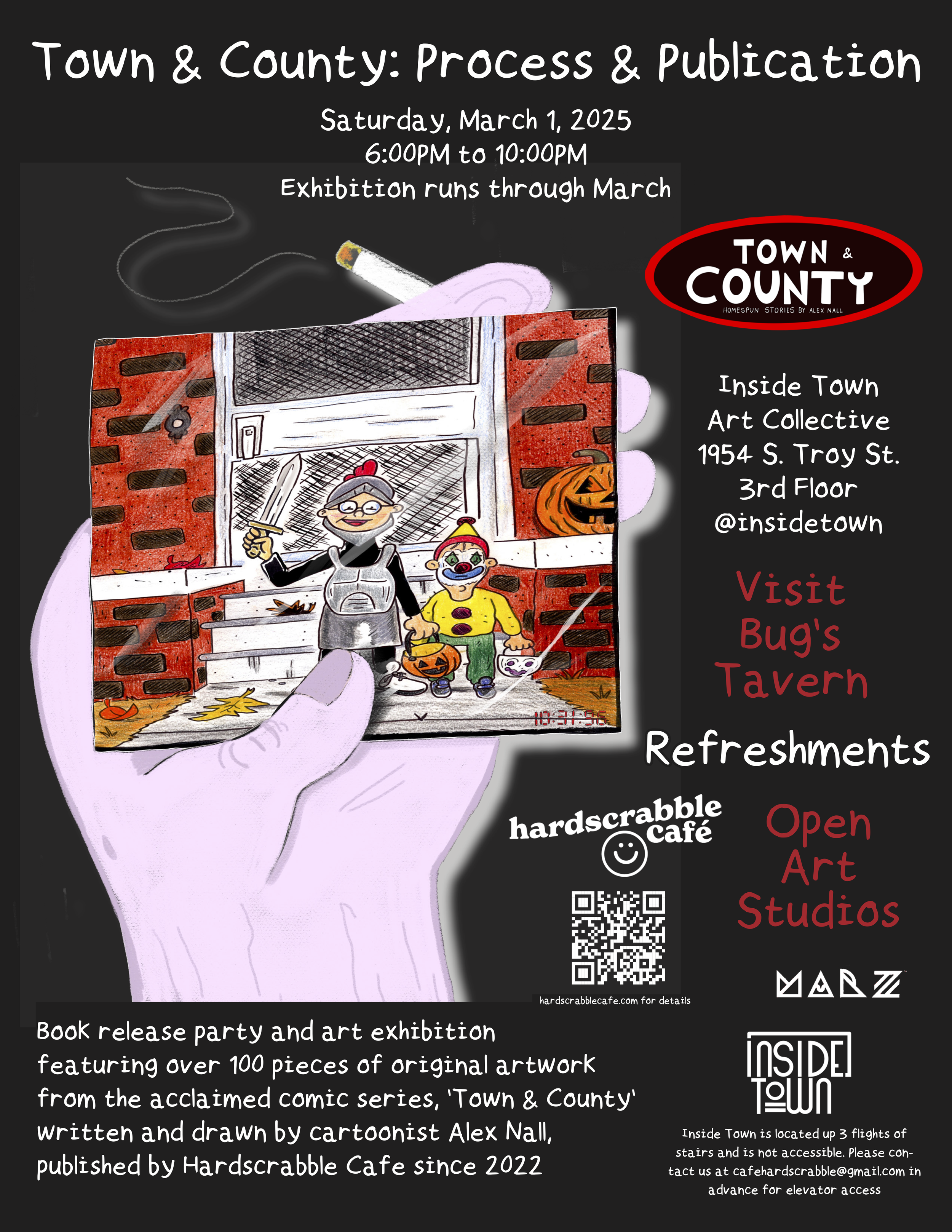 Book release party and art exhibition featuring over 100 pieces of original artwork from the acclaimed comic series, 'Town & County' written and drawn by cartoonist Alex Nall, published by Hardscrabble Cafe since 2022. Visit Bug’s Tavern, tour open art studios & refreshments available.